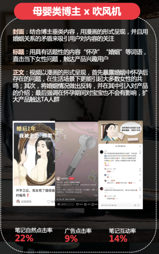 ○優(yōu)化方向: ■小紅書廣告的封面、標題吸引人,要與用戶產(chǎn)生共鳴; ■提升完播率首先筆記內容出發(fā)點具備吸引力,開頭可以抓住用戶,文案盡量做到易讀懂且有干貨信息輸入。比如美妝博主合作可以嘗試攻略/教程/深度測評內容,母嬰博主做育兒攻略合集的內容,都能夠在內容豐富度上提升,留住用戶,提高完播率。 ■示例參考: