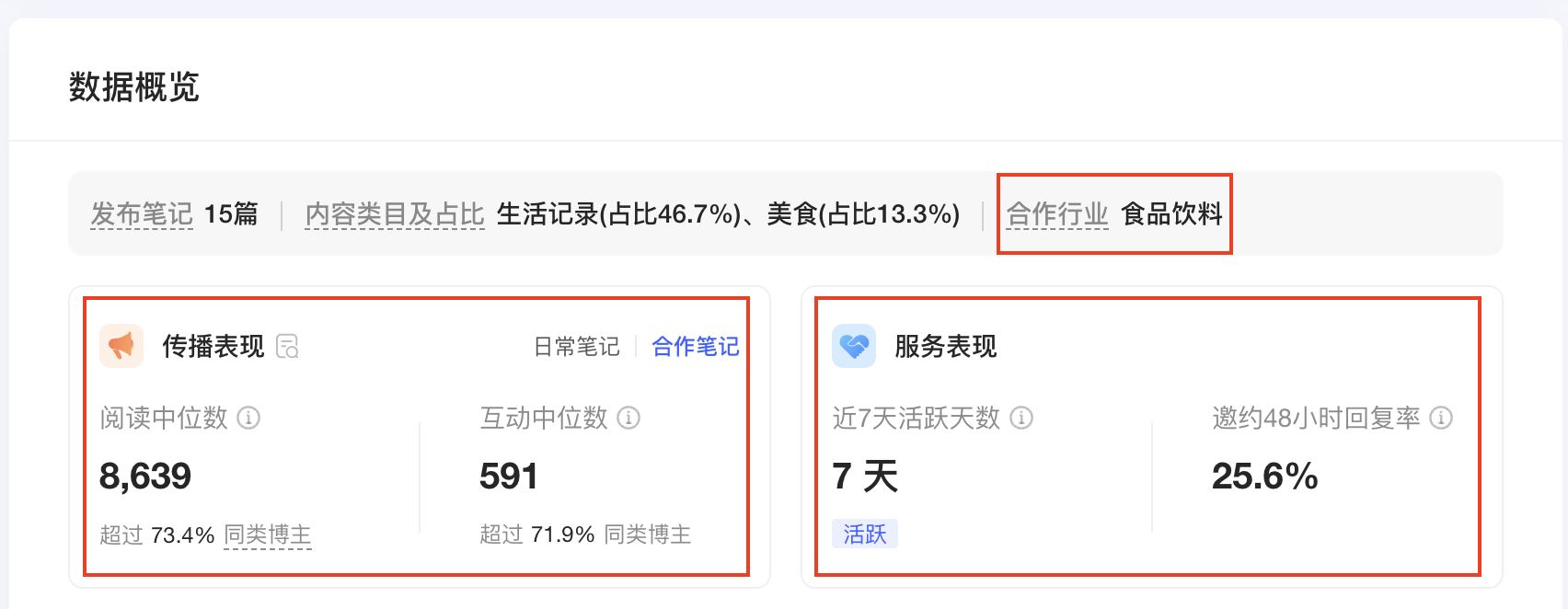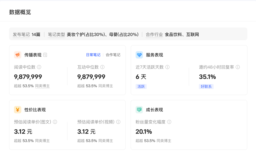 合作信息 | 近期合作行業(yè)、合作傳播表現(xiàn)、服務(wù)表現(xiàn)、合作案例等 | - | 了解“博主近期合作表現(xiàn)如何?” 對(duì)應(yīng)博主近期合作行業(yè)、數(shù)據(jù)、案例、評(píng)價(jià)等 |