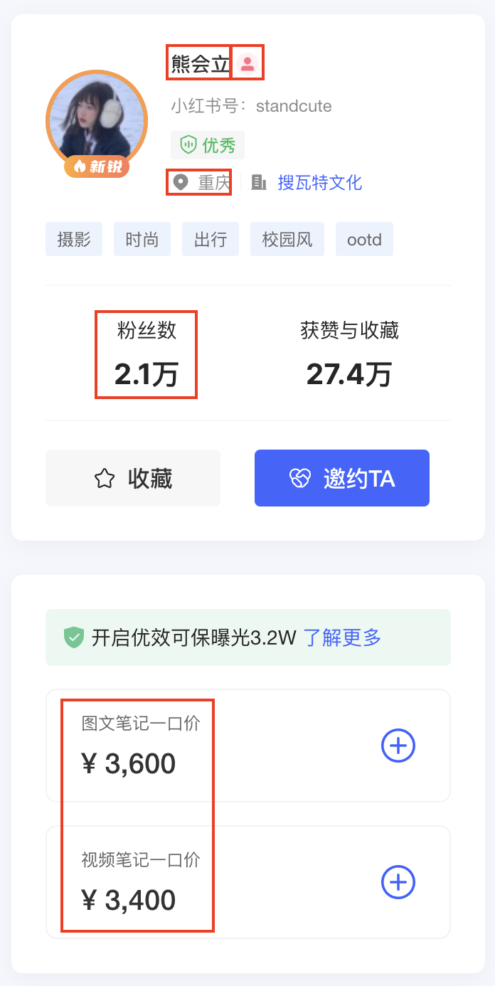基礎(chǔ)信息 | 昵稱、性別、地理位置、粉絲數(shù)、合作報(bào)價(jià)等 |