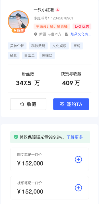 ● 標(biāo)簽人設(shè) 展示博主所屬內(nèi)容類目,人設(shè)標(biāo)簽和特征標(biāo)簽 | 快速定位博主人設(shè)與風(fēng)格,并根據(jù)合作需求判斷博主是否符合本次推廣目標(biāo) |