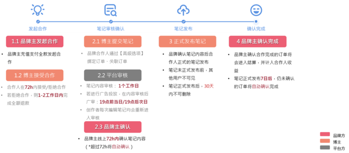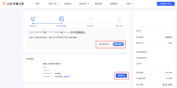 三、筆記審核確認 博主提交筆記之后,需先經過平臺審核,再由品牌查看確認。 1.平臺審核 博主筆記內容需遵守《小紅書社區(qū)公約》、內容合作行業(yè)與內容規(guī)范。 2.品牌主確認 在【訂單管理】中找到對應訂單查看合作詳情,點擊【預覽筆記】認真查看博主筆記,若滿意則點擊【確認通過】,不滿意則點擊【駁回繼續(xù)修改】,每次合作最多駁回3次哦。超過72h未操作,系統將自動確認。