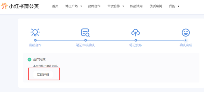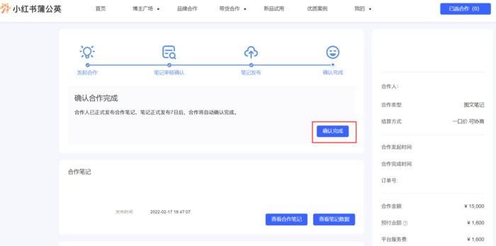四、筆記發(fā)布 筆記通過平臺審核以及品牌方確認通過之后,博主需在小紅書APP內完成筆記正式發(fā)布。正式發(fā)布的筆記30天內不可刪除;圖文筆記可修改,視頻筆記僅可修改文字和話題,視頻不可編輯。 五、確認完成與評價 1.確認完成 筆記正式發(fā)布之后,品牌確認訂單完成,訂單將進入結算并計入合作人收益。筆記正式發(fā)布7日后,仍未確認的訂單將自動確認完成。