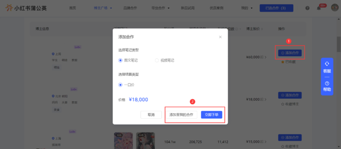 二、發(fā)起合作 1.確定合作博主 1)在博主廣場確定好意向博主之后,點擊【添加合作】后可以立即下單或者添加至我的合作。