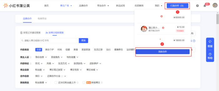 【已選合作】下單:點擊【已選合作】-【發(fā)起合作】,選擇已在列表中的博主確認結算。