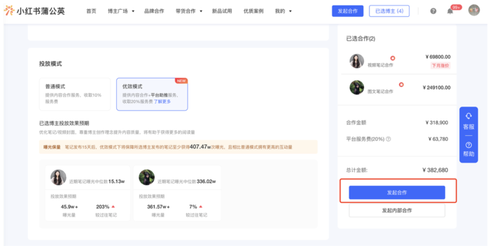 2.2投放模式 在下單的時候可以選擇投放模式,普通模式或者「優(yōu)效模式」。普通模式僅提供內容合作服務,收取10%服務費?!竷?yōu)效模式」提供內容合作+平臺助推服務,收取20%服務費。 內容合作「優(yōu)效模式」是小紅書廣告博主合作的流量保障模式。在下單內容合作筆記時選擇該模式,系統會在筆記發(fā)布后的15天內助推曝光量達到平臺預期的量級(預期曝光量基于博主過往一段時間筆記表現的80分位設定)。同時系統會將筆記推送給更多潛在的興趣用戶,從而提升筆記的互動率。