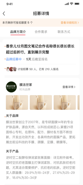 博主點(diǎn)擊單個(gè)項(xiàng)目后,可查看到品牌更詳細(xì)的信息,為品牌創(chuàng)建招募時(shí)填寫的部分字段,參考如圖: