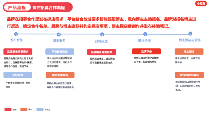 如何邀請(qǐng)小紅書(shū)種草博主進(jìn)行線下探店?發(fā)表時(shí)間:2023-05-19 08:00 一、【招募合作-探店】簡(jiǎn)介 【探店】是小紅書(shū)基于【招募合作】推出的全新合作類(lèi)型,在一口價(jià)合作模式基礎(chǔ)上,由品牌邀請(qǐng)博主線下探店體驗(yàn)并創(chuàng)作小紅書(shū)種草筆記。旨在服務(wù)有探店需求的品牌更高效開(kāi)放的找到主動(dòng)意愿強(qiáng)、內(nèi)容靈感多的優(yōu)質(zhì)博主。 1、產(chǎn)品流程: 品牌發(fā)布【優(yōu)選招募】需求,平臺(tái)智能匹配博主,意向博主主動(dòng)報(bào)名。品牌對(duì)報(bào)名博主進(jìn)行反選,確定合作名單,并根據(jù)聯(lián)系方式與博主建聯(lián)。博主線下探店體驗(yàn)后創(chuàng)作筆記。