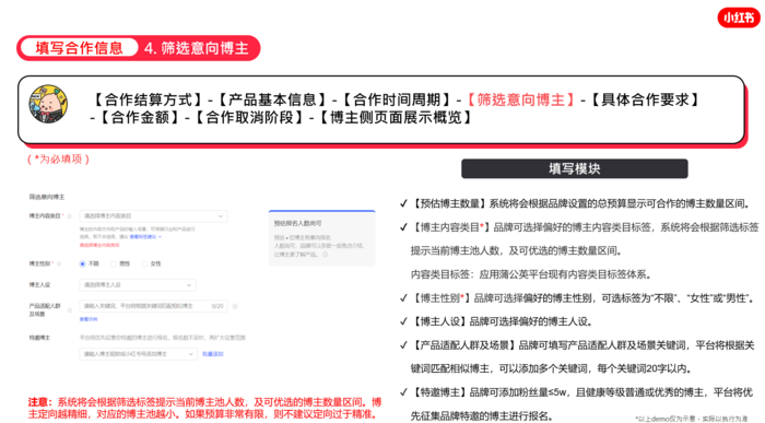 ??關(guān)于時間線可能有變化的幾點說明: 【博主報名時期】系統(tǒng)預(yù)設(shè)K報名時期為4天,但如果產(chǎn)品吸引力較高,或獎金池較大,則有可能出現(xiàn)提前爆滿的情況,此時報名期會提前結(jié)束,自動進入博主確認(rèn)期,但博主確認(rèn)期結(jié)束時間不變。 舉例來講,某內(nèi)容合作博主報名期用了2天,提前進入品牌確認(rèn)名單環(huán)節(jié),品牌確認(rèn)期周期不變,即確認(rèn)博主名單的結(jié)束日期提前。 【博主名單確認(rèn)期】系統(tǒng)預(yù)設(shè)確認(rèn)名單為3天,但如果品牌1天就確認(rèn)名單,則確認(rèn)期結(jié)束,進入到寄樣期。品牌寄樣和博主體驗期將提前開始。 4)篩選意向博主