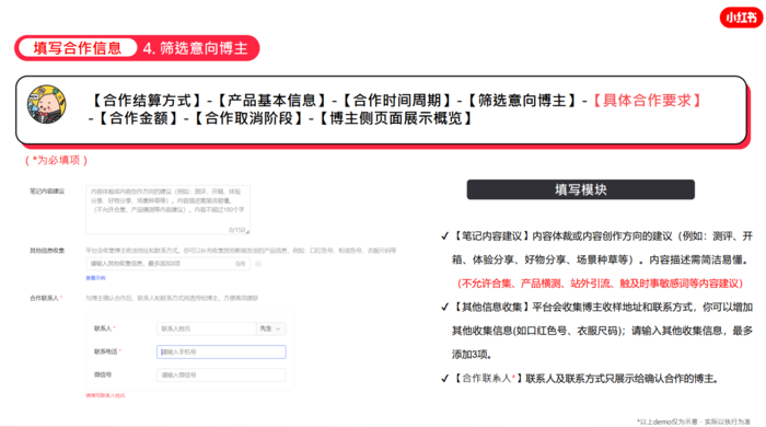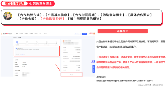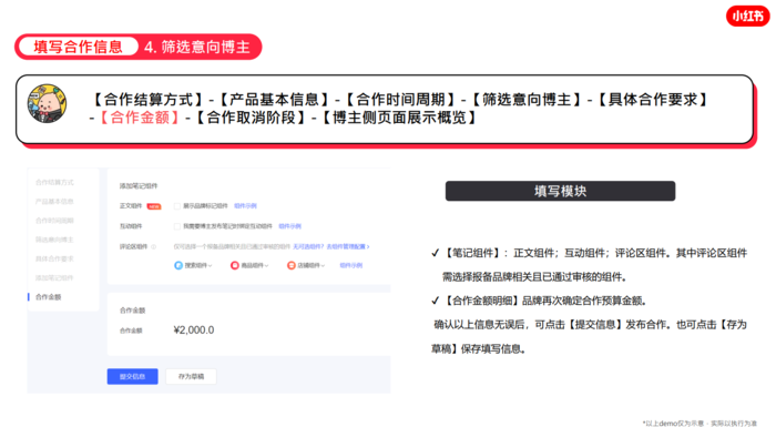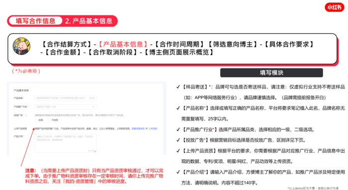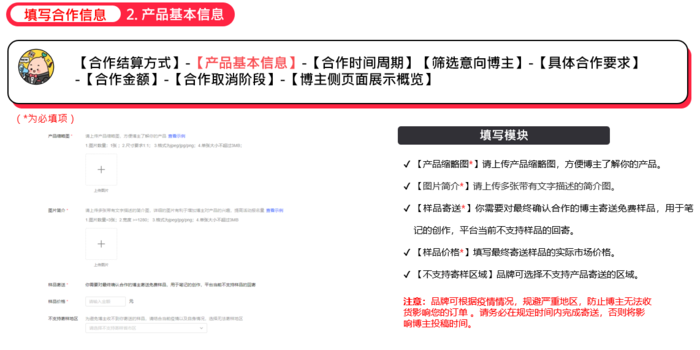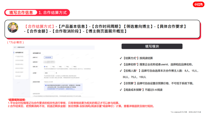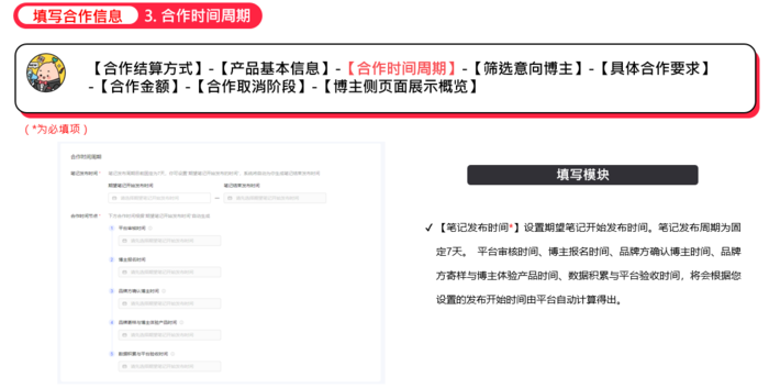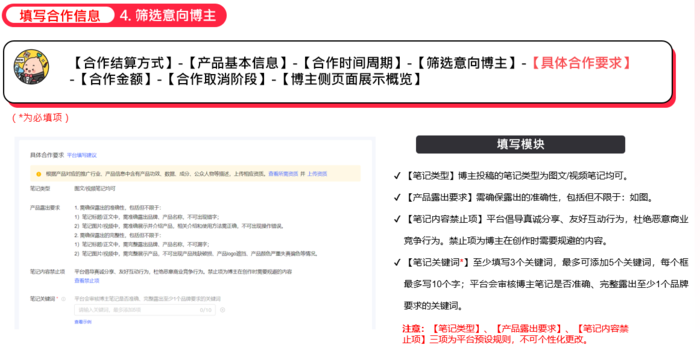 2.填寫合作信息 進入新建共創(chuàng)合作頁面后,請?zhí)顚懖⒉榭匆韵履K信息:【合作結(jié)算方式】—【產(chǎn)品基本信息】—【合作時間周期】—【篩選意向博主】—【具體合作要求】—【合作金額明細】,完成共創(chuàng)合作的發(fā)布。 1)合作結(jié)算方式