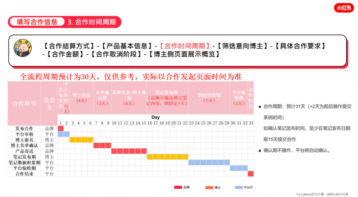注意:確認(rèn)期不操作,就平臺自動確認(rèn)。 審核期一直無法通過,則合作自動取消。 合作時間周期概覽: