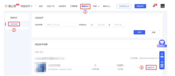 方法二:進入首頁,點擊 【數(shù)據(jù)中心】,選擇導(dǎo)航欄【共創(chuàng)合作】,點擊合作列表【數(shù)據(jù)報告】查看。