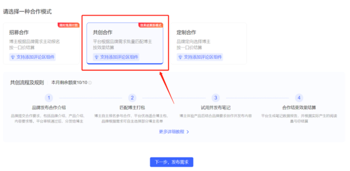 小紅書廣告投放發(fā)布合作信息需要注意什么?發(fā)表時間:2023-05-27 08:00 一、如何開啟合作 1.登錄小紅書廣告投放平臺,點擊頁面右上角【發(fā)起合作】—選擇【共創(chuàng)合作】—點擊【下一步,發(fā)起合作】即可進入合作信息填寫頁面